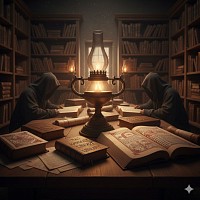 "A mystical library scene featuring scholars reading ancient codices by the light of a central oil lamp."